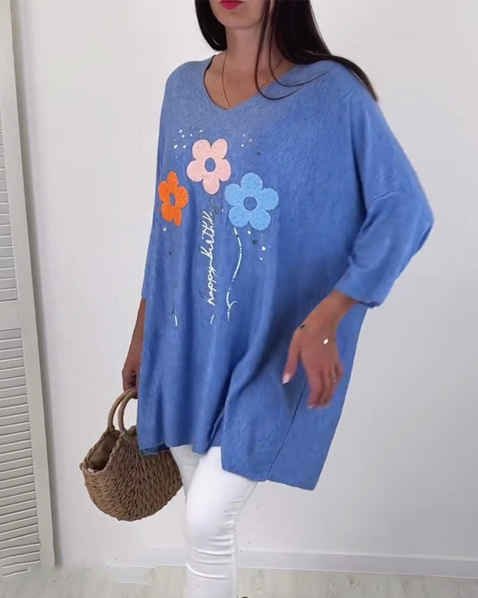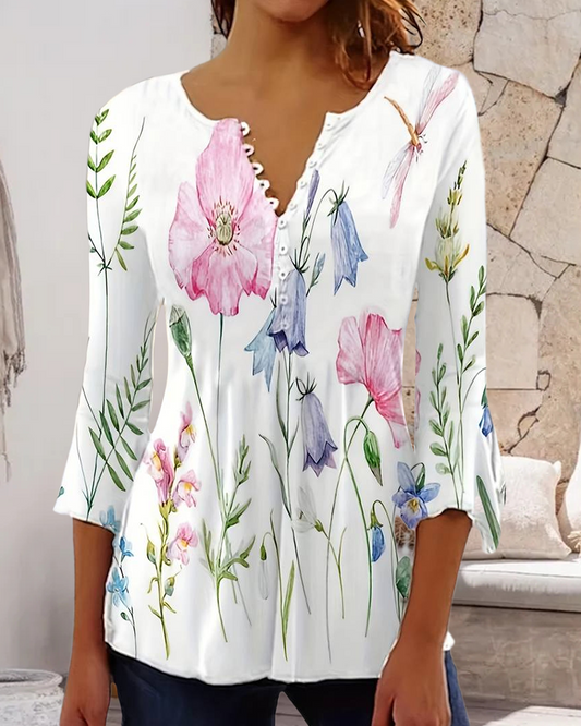 Uformell t-skjorte med kortermet V-hals med blomstertrykk
