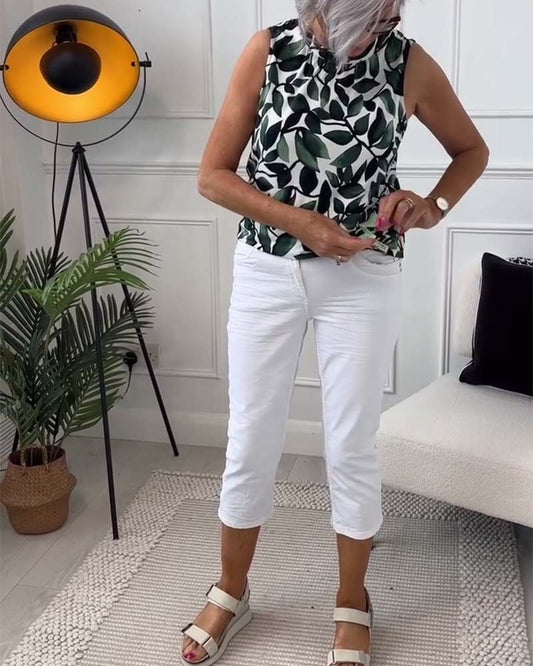 Uformell, ermeløs plissert tanktopp med bladtrykk