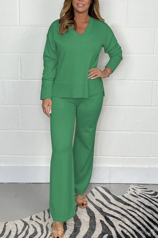 Einfarbiger weicher Strick-Freizeitanzug mit V-Ausschnitt für Damen, Modetrends