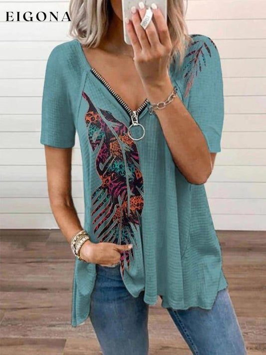 Vintage Aztec Print V-hals T-skjorte med glidelås for kvinner