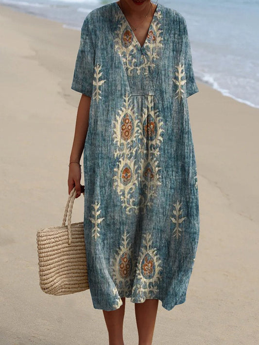 Lässiges, fließendes Kleid für Damen im Vintage-Stil mit Blumenmuster und ethnischem Kunstdruck