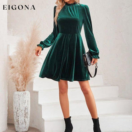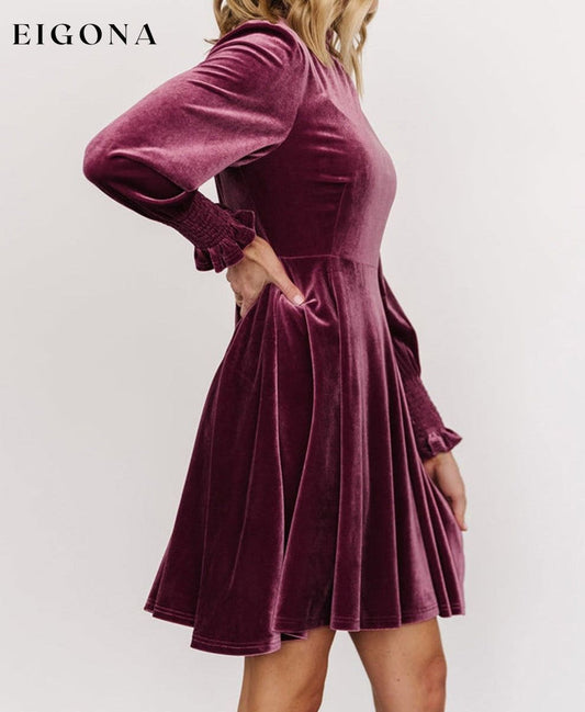 Burgund langermet kjole, smocked høyhalset volangermet fløyelskjole