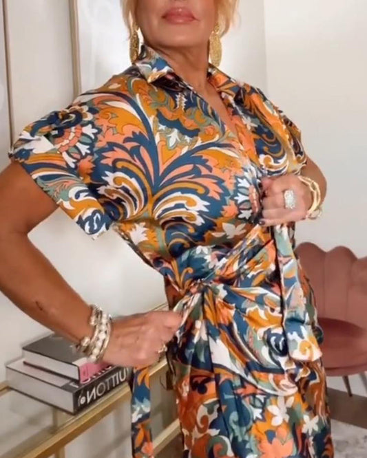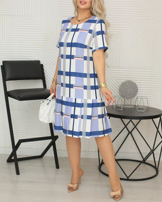 Uformell, kortermet kjole med rund hals med blomstertrykk