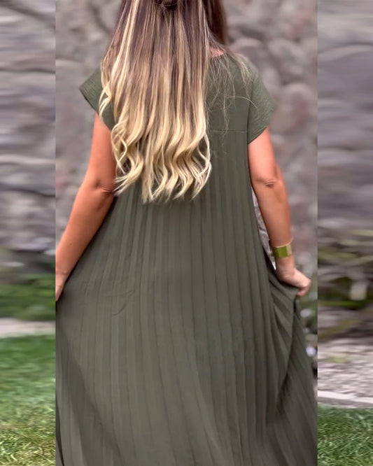 Plissiertes bodenlanges Kleid mit Rundhalsausschnitt