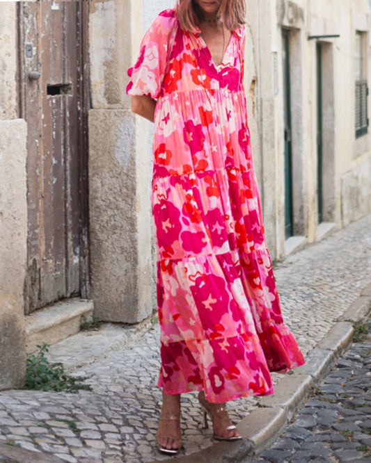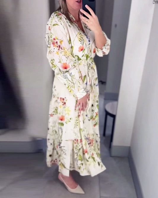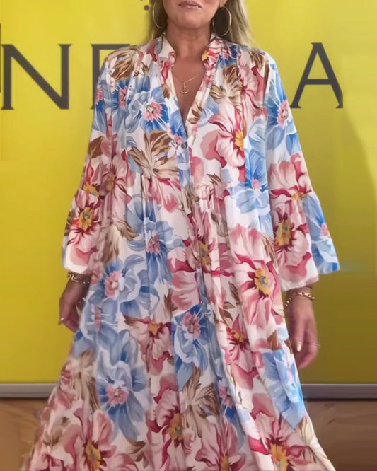 Ermeløs maxi-kjole med splitt med blomstertrykk