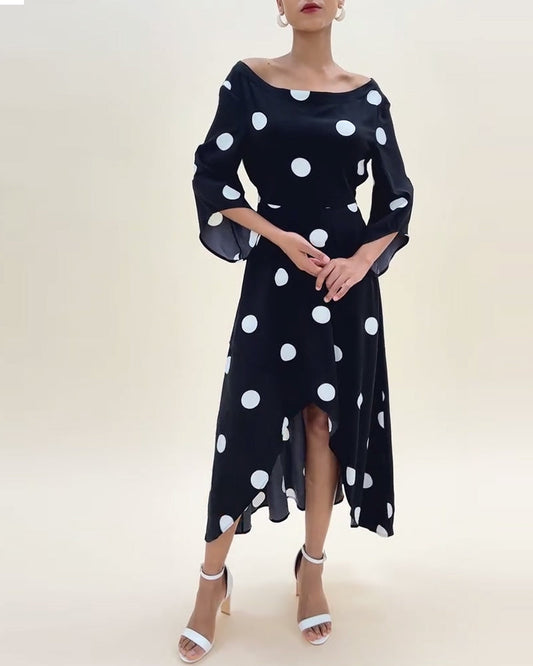 Kjole med 3/4-ermer off-shoulder med polkaprikk