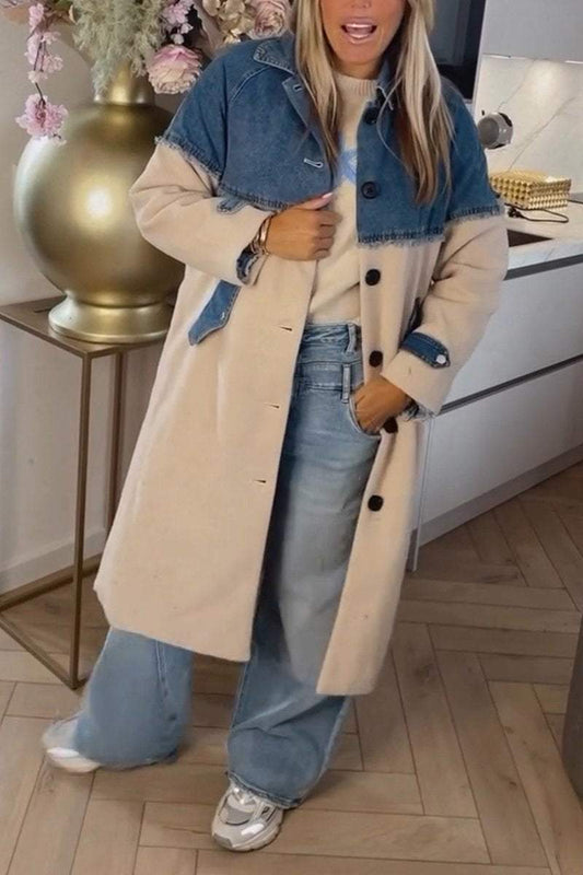 Lapel-jakke med enkeltspent denim patchwork-jakke for kvinner
