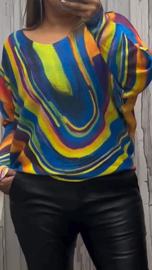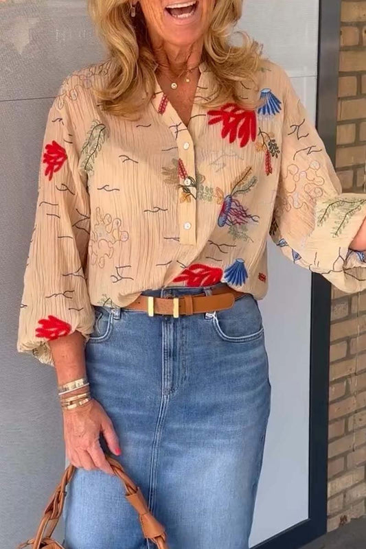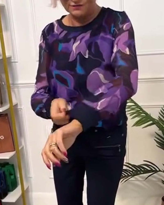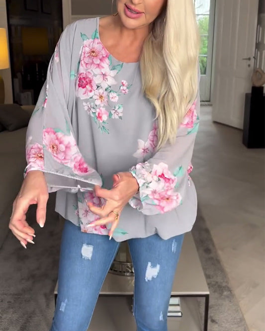 Elegant topp med lange ermer med rund hals med blomstertrykk