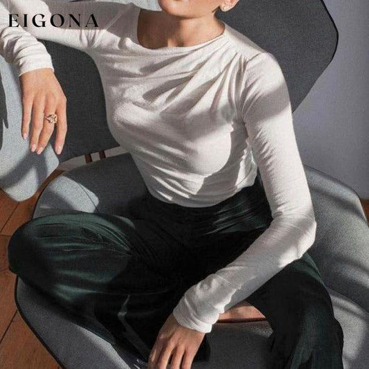 Ny ensfarget allsidig rundhals plissert langermet indre slim fit T-skjorte