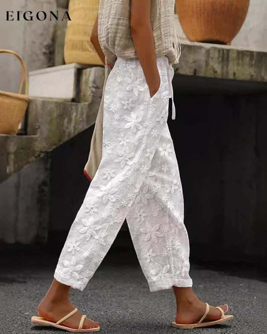 Ensfargede fritidsbukser med blomsterbrodert blonder