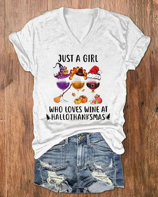 Damen T-Shirt mit V-Ausschnitt und Aufdruck „Just A Girl Who Loves Wine At Hallothanksmas“