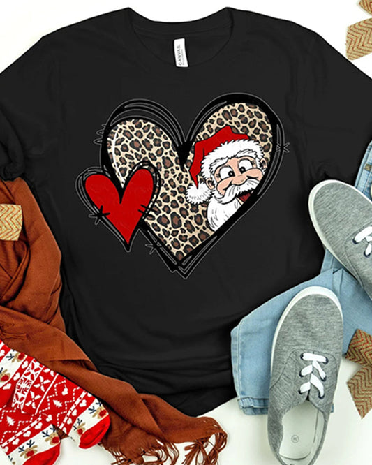 Kurzärmliges T-Shirt mit Weihnachtsmann-Leoparden- und Herz-Print