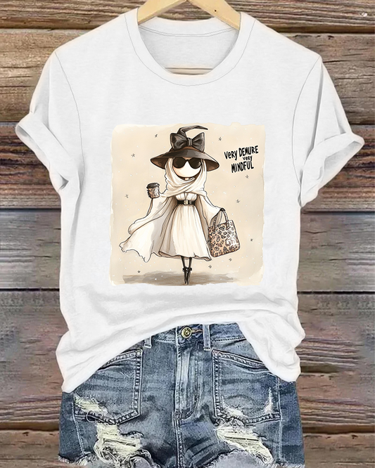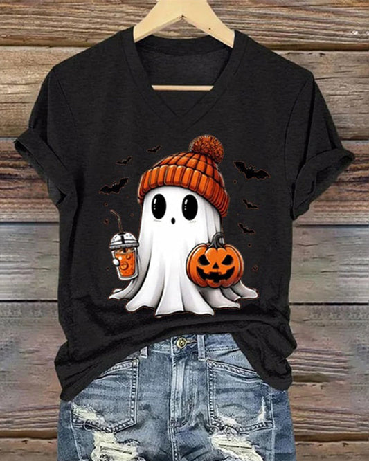 T-Shirt mit V-Ausschnitt und Geister-Print für Damen