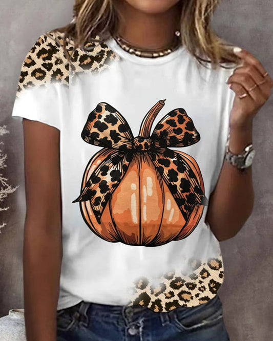 Lässiges Halloween-T-Shirt mit V-Ausschnitt und Leopardenmuster für Damen