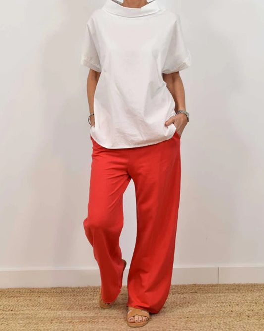 Ensfarget plissert T-skjorte med rund hals og kortermet