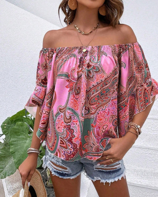 Bluse med trykk med en skulder med sommerfuglermer