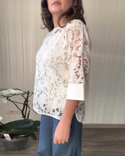 Ensfarget hul bluse med rund hals