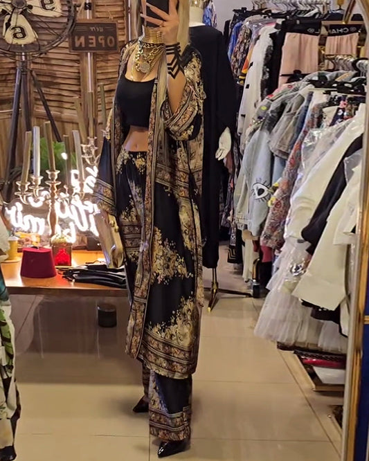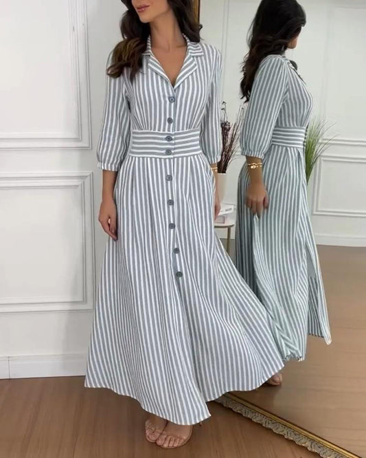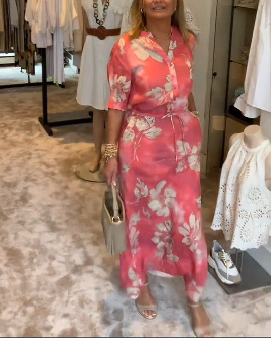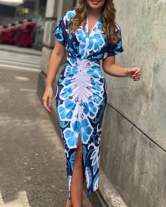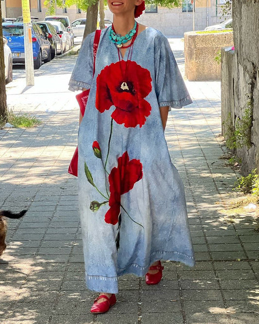 Langes Kleid mit Puffärmeln und V-Ausschnitt und floralem Temperament