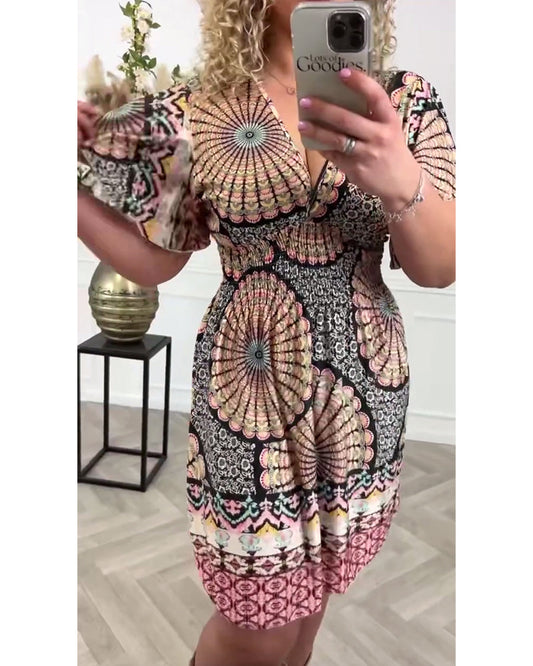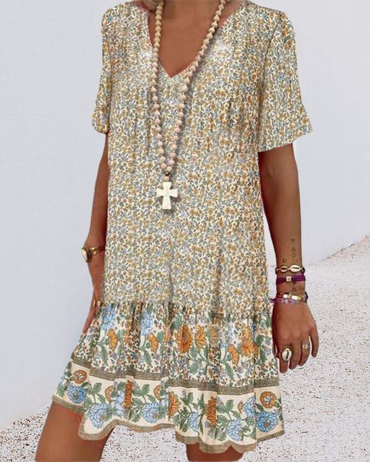 Kortermet feriekjole med blomstertrykk med V-hals