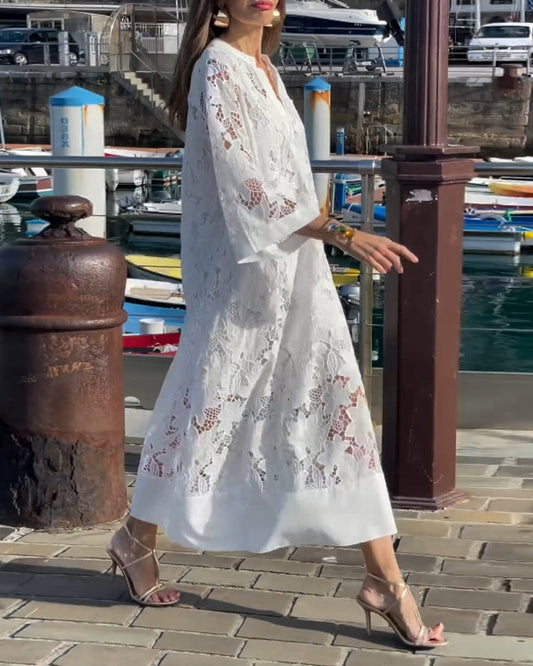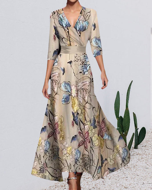 Lang kjole med V-hals, premium midjetrykt