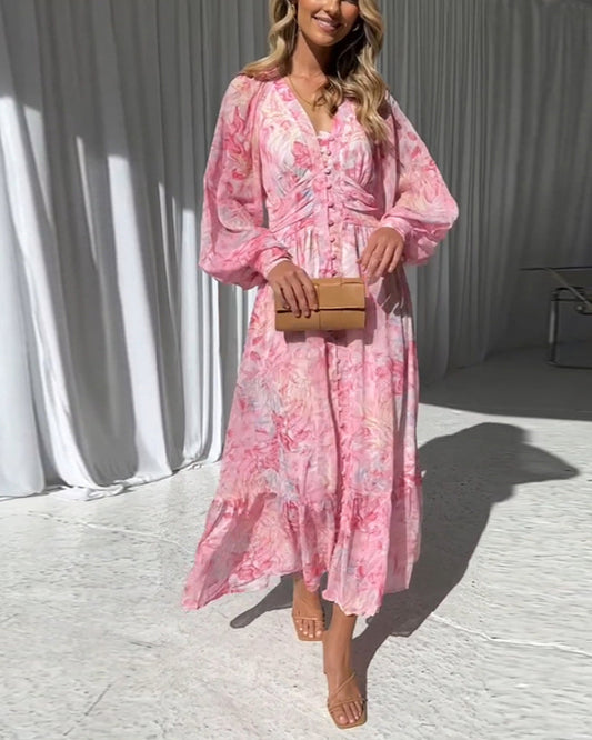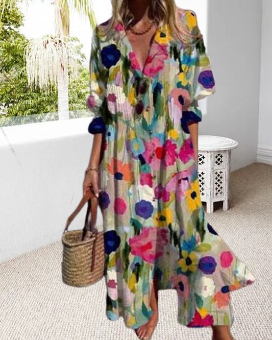 Lang kjole med V-hals og fargerik print