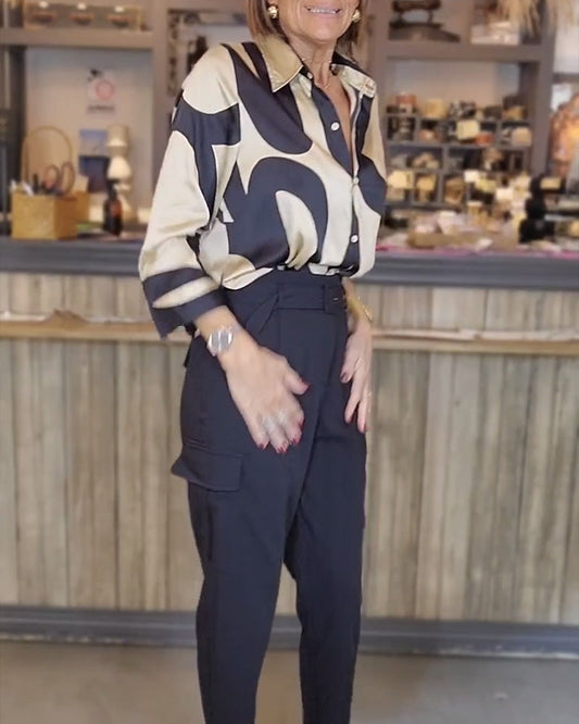 Elegant kjole med kontrasterende geometrisk trykk og jakkeslag