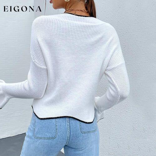 Brun flettet V-hals Puff Sleeve Strikket Langermet Topp, Genser