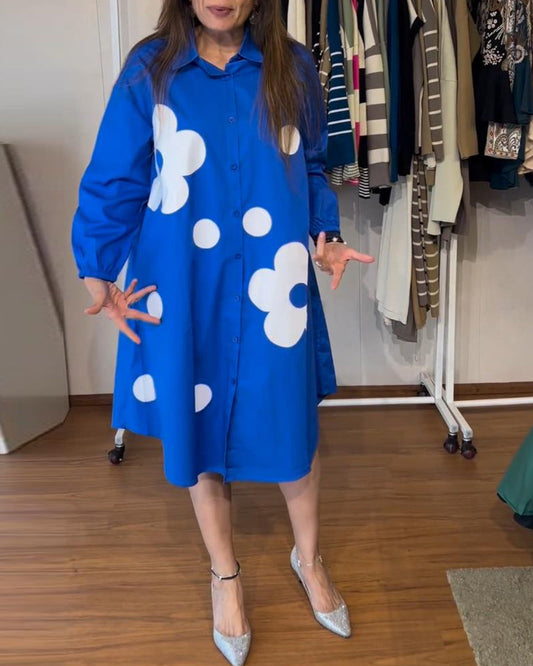 Vestido casual com estampa floral e botão de lapela
