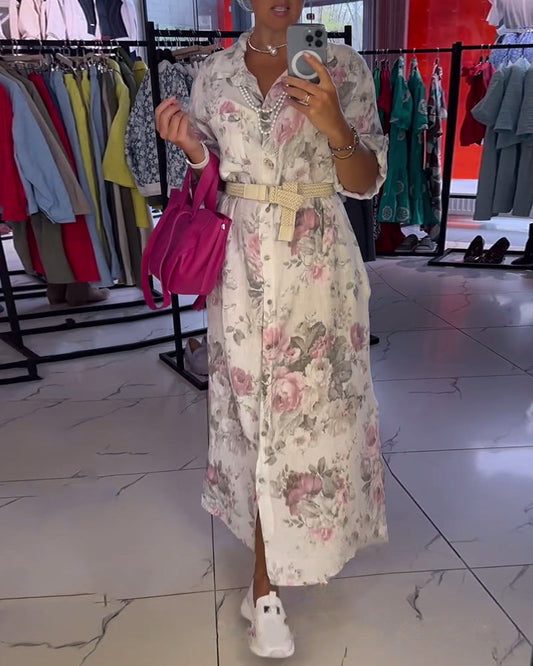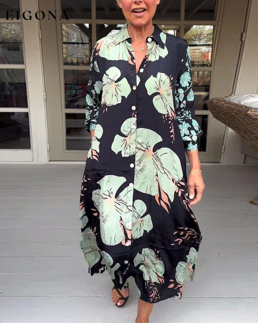 Vestido maxi casual com estampa floral e lapela e botões
