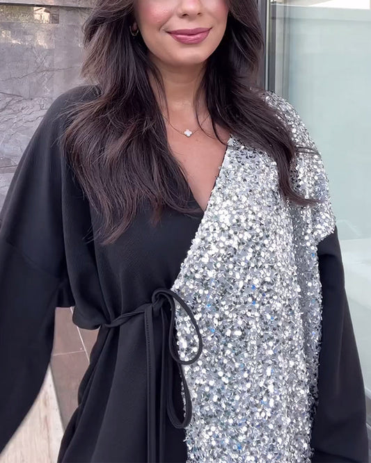 Locker sitzendes Kleid mit V-Ausschnitt und Pailletten