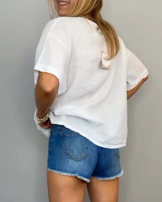 Lässiger Kurzarmpullover mit V-Ausschnitt und einfarbigem Knopf