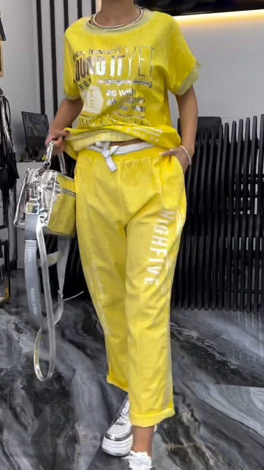 Terno feminino de manga curta com estampa dourada e gola redonda
