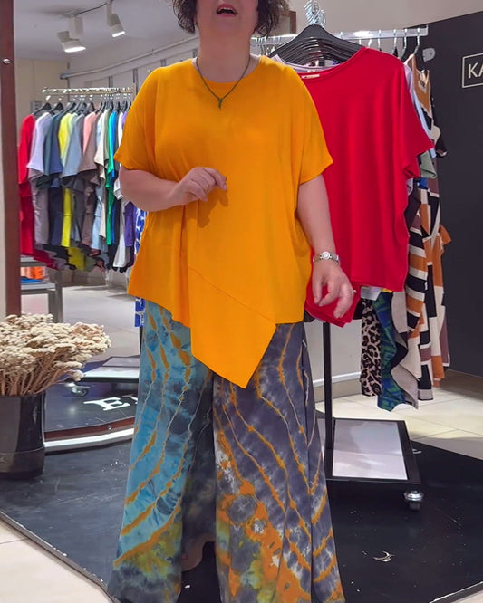 Blusa casual de cor sólida com gola redonda e costura irregular