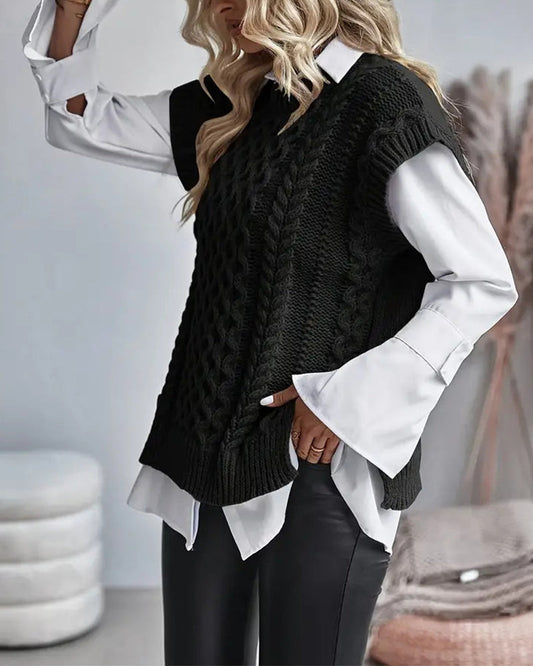 Lässiger, einfarbiger Rundhalspullover mit Zopfmuster