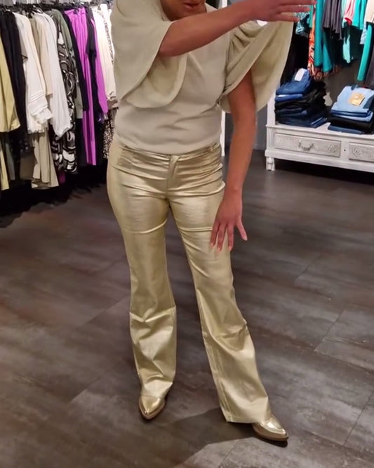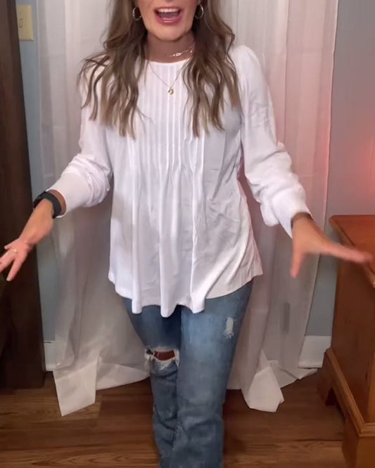Blusa casual de cor sólida com gola redonda e manga comprida plissada