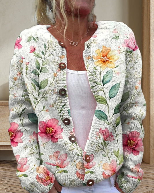 Lässiger Cardigan mit Blumenknöpfen und langen Ärmeln
