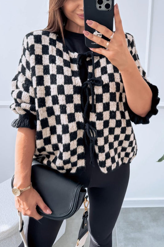 Modische Strickjacke mit langen Ärmeln und Schnürung in Volltonfarbe