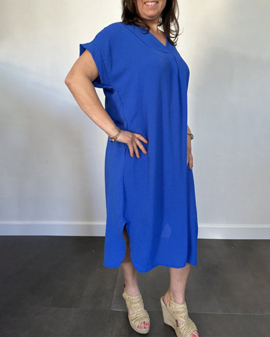 Einfarbiges, lockeres, gerades Kleid mit V-Ausschnitt