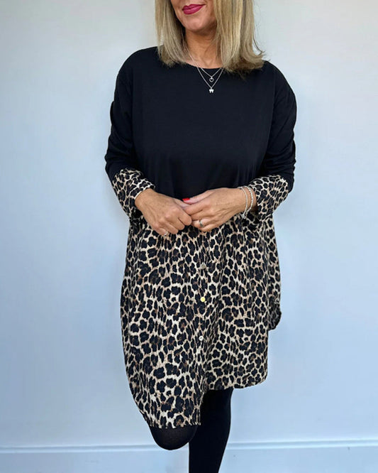 Kleid mit Rundhalsausschnitt und langen Ärmeln und Leopardenmuster