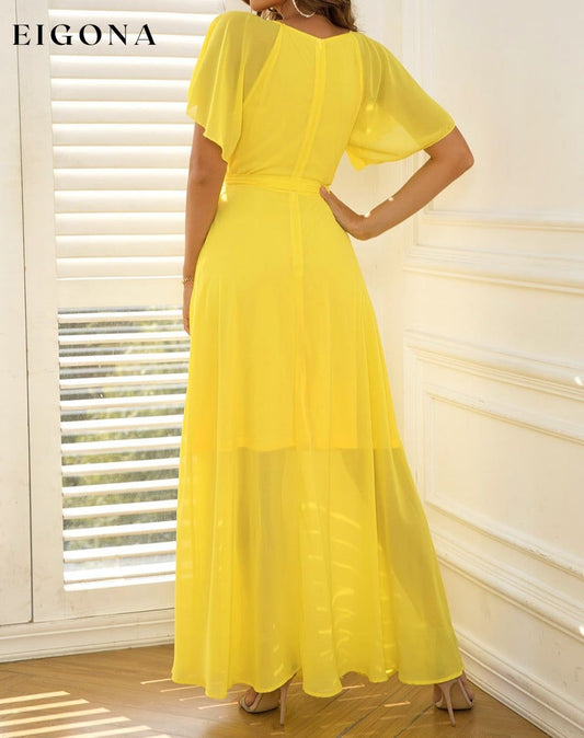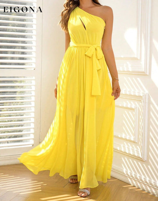 Vestido Maxi Amarelo Recortado com Um Ombro na Cintura e Gravata