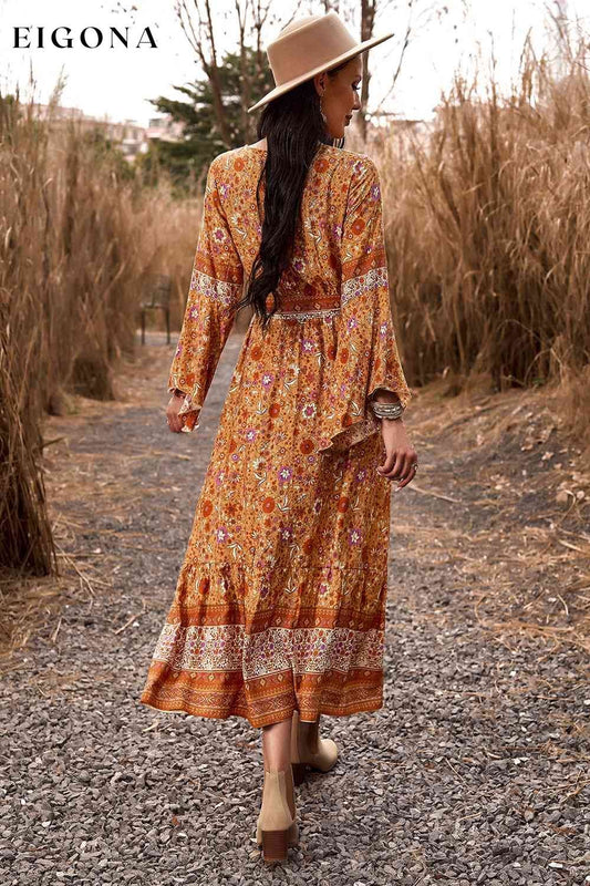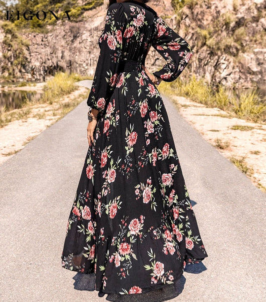 Vestido maxi casual floral com decote em V dividido manga comprida