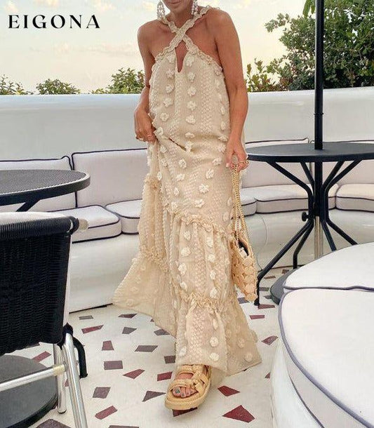 Vestido maxi da moda feminina, vestido maxi com gola halter e flores tridimensionais para esfregar bolo