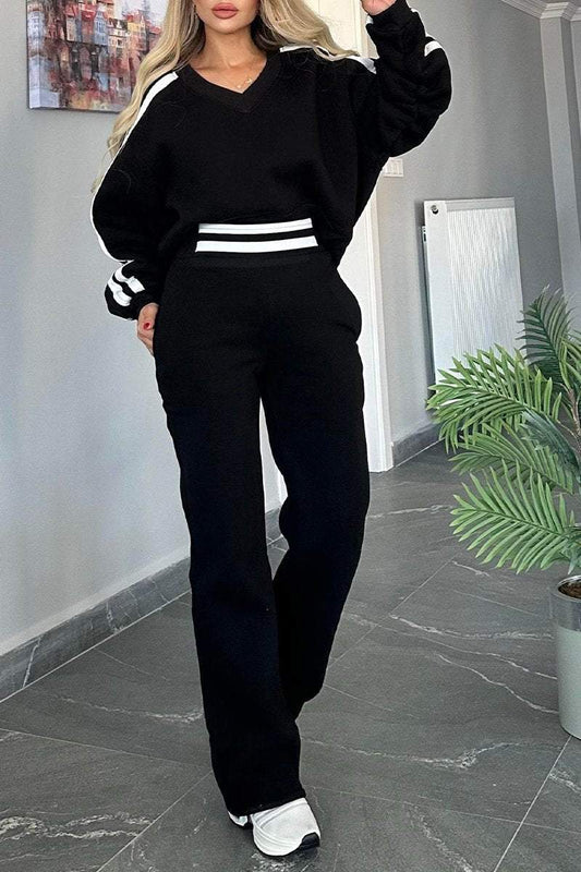 Lässiger Sweatshirtanzug mit V-Ausschnitt, langen Ärmeln und Streifendesign