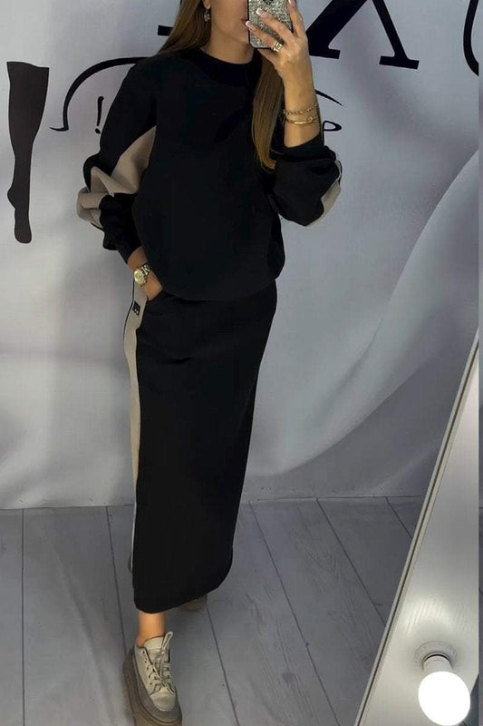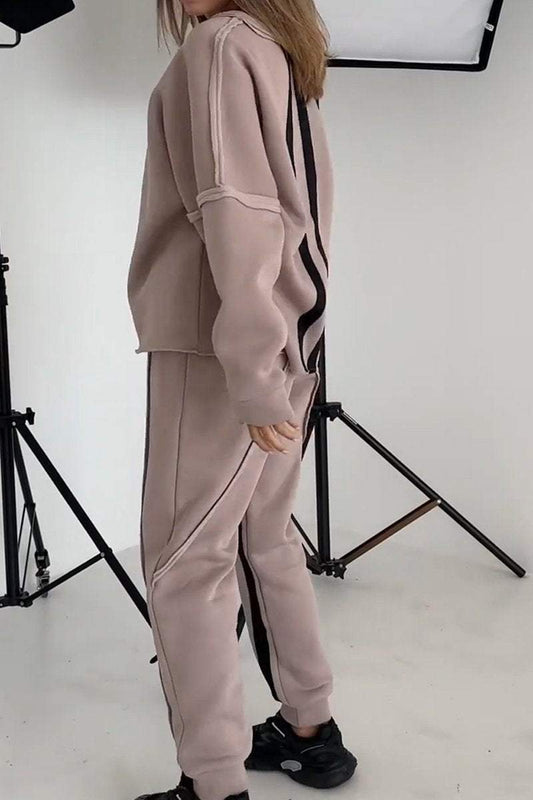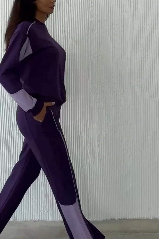 Lässiger zweiteiliger Anzug mit Rundhalsausschnitt und langen Ärmeln in Kontrastfarbe für Damen