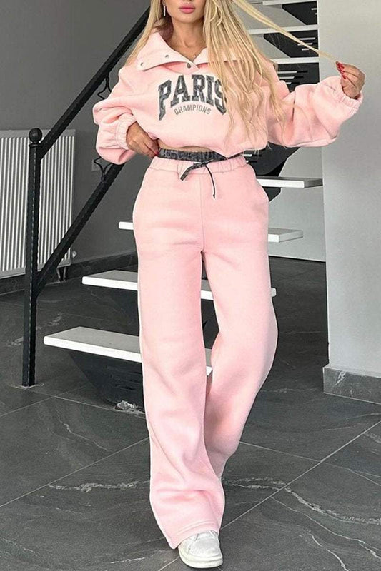 Damen Revers Langarm Halbreißverschluss Buchstabendruck Freizeitanzug