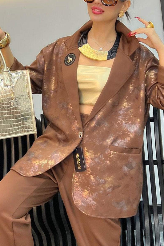 Damen Freizeitanzug mit Revers und langen Ärmeln und Goldprägung