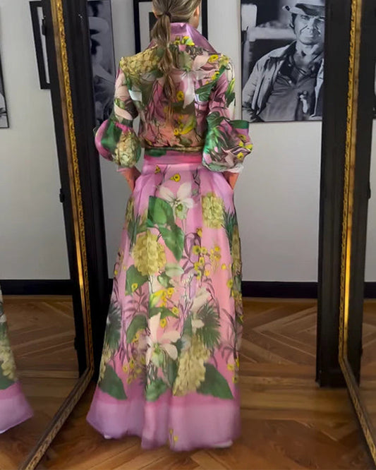 Vestido maxi estiloso com lapela e estampa floral com bolso