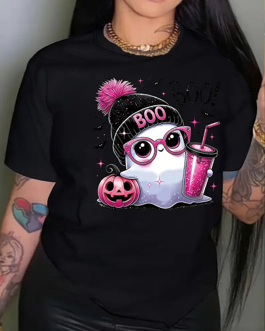 Kurzärmliges T-Shirt mit Rundhalsausschnitt und Halloween-Grafikdruck für Damen