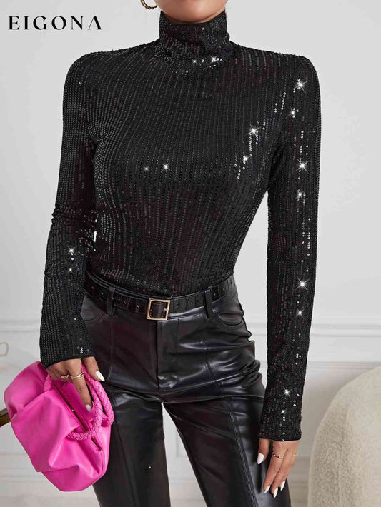 Top de manga comprida com gola alta de lantejoulas, blusas de lantejoulas